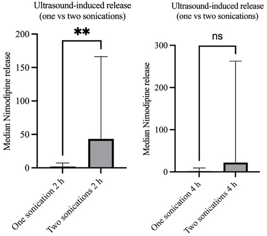 Nimodipine release profile two and four hours after a singular versus repeated sonication showing a significantly increased nimodipine concentration in the group with repeated sonication after two hours, but without a significant difference between the two groups after four hours. “**” states a statistically significant difference. “ns” states non-significant differences.