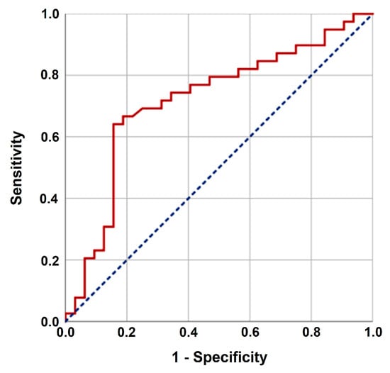 Receiver operating characteristic curve analyses outcomes. Area under curve: 71.8%; sensitivity: 71.8%; specificity: 70.3%; J-index: 0.421.
