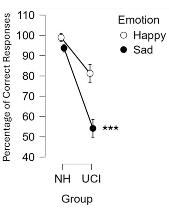 The graph represents the percentage of correct responses in the categorization of happy and sad musical excerpts for each group: unilateral cochlear implant users (UCI) and normal hearing (NH) controls. The interaction between the variables emotion (happy/sad) and group (UCI/NH) was statistically significant (p = 0.040). Error bars stand for standard error. *** stands for significance level of the post hoc comparisons of p ≤ 0.001.