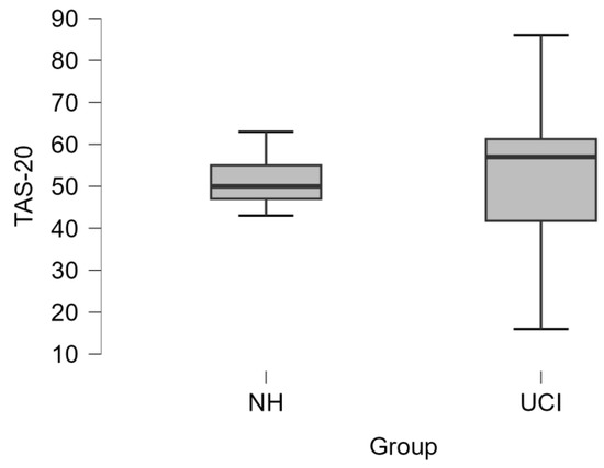 The comparison between NH and UCI groups did not show any difference concerning TAS-20 scoring (t = −0.166 p = 0.869) (Figure 2). Also, the assessment of the alexithymia occurrence in the two groups (NH: 1 alexithymic and 7 nonalexithymic/alexithymic traits; UCI: 6 alexithymic and 14 nonalexithymic/alexithymic traits) did not show statistical significance (Fisher’s exact test p = 0.633).
