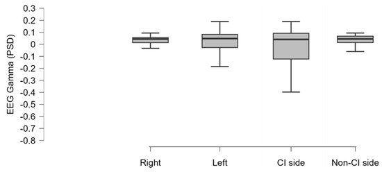 The boxplot represents the mean EEG gamma activity (PSD: power spectral density) estimated in the UCI group and resulting from the averaging of the signal acquired from the electrodes located in each hemisphere (right, left. CI side, non-CI side), as specified in the Methods section. No statistically significant differences were evidenced.