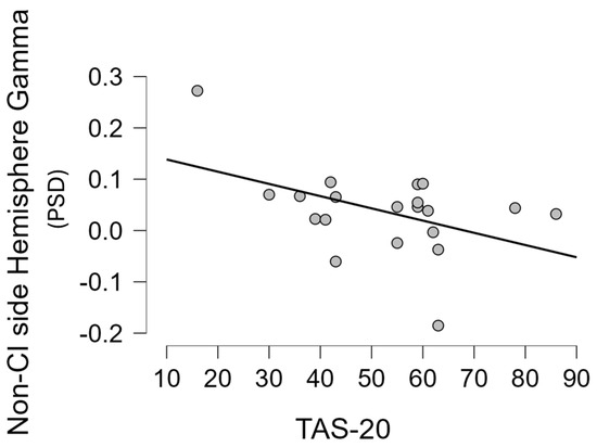 Moreover, for each group, we performed a correlation analysis between the mean gamma activity in the hemispheres (right/left and CI/non-CI side) and some demographic, clinical, and behavioural variables (for the NH group only the TAS-20 score, age, and percentage of correct responses were included in the analysis). In particular, a statistically significant negative correlation was found between gamma activity in the non-CI side and age at recording (r = −0.523 p = 0.018), and the TAS-20 score (r = −0.456 p = 0.043) (Figure 4), but not with the percentage of correct responses (r = −0.160 p = 0.499), with the residual hearing in the contralateral ear (r = −0.146 p = 0.539), with the time of CI use in months (r = −0.087 p = 0.714), or with the duration of deafness (r = 0.138 p = 0.562). Moreover, in the UCI group, a statistically significant negative correlation between the mean gamma activity in the right hemisphere and the age of the participants (r = −0.612 p = 0.004) was found. The abovementioned statistically significant correlation was, instead, not found in the UCI group when considering the gamma activity in the CI side, nor in the left and right sides for any of the just mentioned variables. Similarly, they were also not found in the NH group when performing the same analysis.