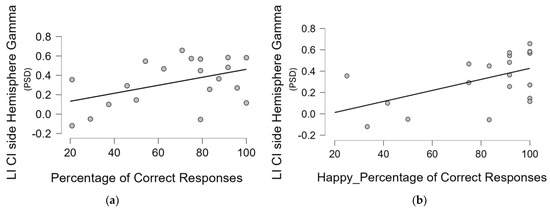 Finally, a similar analysis was also performed on the LI gamma, calculated considering both the right/left and UCI/non-UCI side and the abovementioned clinical and behavioural variables; the results showed a positive correlation between LI based on the CI side and the percentage of correct responses, that is, a correlation between a higher relative gamma activity on the CI side and the performance in the emotional recognition task (Pearson’s r = 0.448 p = 0.048) (Figure 5a). In addition, given the higher percentage of correct responses found for the happy in comparison to the sad musical excerpts, and the post hoc analysis on the interaction between the type of emotional content and the group showing such evidence holding true for the UCI group, we performed in all groups a correlation specifically between gamma LI and percentage of correct responses for happy and sad musical pieces separately. The results showed that only in the UCI group was there a positive correlation between gamma LI calculated, considering the side of the CI and the percentage of correct responses for the happy musical pieces (Pearson’s r = 0.521 p = 0.019) (Figure 5b).