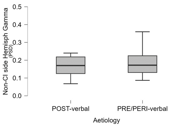 The boxplot represents the difference between postlingual and pre-/perilingual deaf UCI with respect to the mean gamma activity (PSD: power spectral density) in the non-CI side hemisphere (p = 0.045).