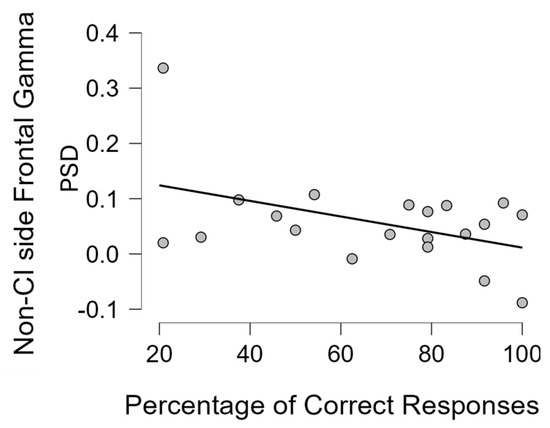 The scatterplot represents the statistically significant correlation (Pearson’s r = −0.446, p = 0.049) between the average gamma activity (PSD: power spectral density) estimated in the frontal area contralateral to the CI side and the percentage of correct responses in the UCI group.