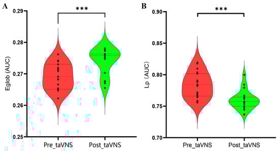 Differences in global properties of patients with MDD before and after taVNS treatment based on AUC values. (A) Eglob in patients with MDD; (B) Lp in patients with MDD. Abbreviations: Eglob, global efficiency; taVNS, transcutaneous auricular vagus nerve stimulation; Lp, characteristic path length; MDD, major depressive disorder; AUC, area under the curve. *** p < 0.001.