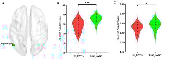 After 4 weeks of taVNS treatment, our study found that patients with MDD demonstrated increased DC and NE in the left AG, which was a key node of the DMN. Dysfunction of the DMN has been widely reported in patients with MDD, which is associated with the processing of self-reference, emotional appraisals, and rumination [51]. Previous studies have reported that patients with MDD had decreased nodal topological properties within the DMN [28,41,52], suggesting that the ability of information transmission was impaired in MDD. Li et al. also found that ECT can improve the depressive symptoms in patients with MDD by enhancing the NE of the DMN [22].