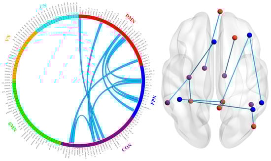 Compared with baseline values, after 4 weeks of taVNS treatment, patients with MDD showed decreased FC in several regions, which contained 16 nodes and 10 edges (p < 0.05, FDR corrected), mainly relating to the default mode network (DMN), frontoparietal network (FPN), and cingulo-opercular network (CON). These edges connected the left thalamus and the right ventromedial prefrontal cortex (vmPFC), the right thalamus to the right superior frontal cortex, the right inferior parietal lobe and left middle insula to the left occipital cortex, the left inferior parietal lobe to the right precuneus, the right dorsolateral prefrontal cortex (dlPFC) to the right precuneus, the right superior temporal cortex to the right occipital cortex, the right inferior parietal lobe to the right dlPFC, the left middle insula to the left anterior cingulate cortex, and the left middle insula to the left parietal lobe. Specifically, after taVNS treatment, patients with MDD exhibited reduced connectivity between the DMN–FPN, DMN–CON, and FPN–CON (all p < 0.05, FDR corrected). The visualization of these alterations in FC is shown in Figure 5.