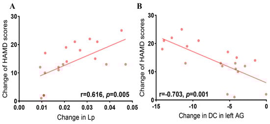 The correlation analysis indicated that the change in Lp was associated with changes in HAMD scores in patients with MDD (r = 0.616, p = 0.005). Furthermore, changes in DC in the left AG were negatively associated with changes in HAMD scores (r = −0.703, p = 0.001) (Figure 6).