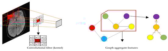 - Neighborhood Aggregation: Adapting Convolution to GraphsAt the heart of both CNNs and GNNs is the idea of localized information processing. In CNNs, a convolution operation involves sliding a filter (kernel) over small, fixed-sized regions of an image, aggregating pixel values within each region to detect patterns like edges or textures. GNNs adopt this concept by introducing a neighborhood aggregation mechanism, where each node updates its representation by combining information from its directly connected neighbors. This process is often referred to as “graph convolution”, which mimics the local receptive field of CNNs but operates on irregular graph structures. For instance, instead of aggregating values from a 3 × 3 patch of pixels, a node in a GNN aggregates features from its neighboring nodes based on the graph’s adjacency structure. This concept is visualized in Figure 3, which highlights the distinction between the two approaches.