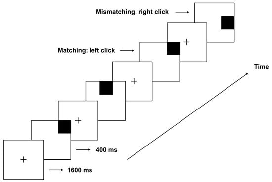 At the beginning of each trial, a fixation point was presented at the center of the screen for 1600 ms, indicating an upcoming stimulus. The first black square then appeared at a random grid position (e.g., position A) for 400 ms before disappearing. Another fixation point was subsequently displayed for 1600 ms, allowing participants to consolidate memory and prepare for the upcoming stimulus. The second black square (position B) was then presented similarly (displayed for 400 ms before disappearing), requiring participants to retain positions A and B in memory. Upon appearance of the third black square (position C), participants were tasked with determining quickly and accurately whether its position matched that of position A. If the positions matched, participants pressed the left mouse button; if not, they pressed the right mouse button. Trials with matching and non-matching positions were randomly mixed in a 1:1 ratio to balance experimental conditions. A practice task was administered before the formal experiment to ensure data reliability, requiring participants to attain a minimum accuracy rate of 85% before proceeding (Figure 1).