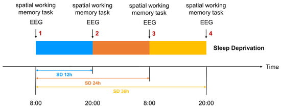 Sleep is one of the most fundamental physiological needs for humans, serving not only as a critical factor in the restoration of bodily functions but also as a crucial period for brain memory consolidation and cognitive optimization []. However, the fast-paced lifestyle and working patterns of modern society have made sleep deprivation increasingly common, posing a significant public health risk. Prolonged sleep deficiency encroaches upon the valuable time window available for the brain to integrate and optimize memories, while simultaneously impairing cognitive functions and emotional states, such as vigilance, attention, memory capacity, and decision-making efficiency [,]. In this context, spatial working memory, as the nexus for processing visual and spatial information, may face unprecedented challenges in sensitivity to information capture, stability in information maintenance, and flexibility in information manipulation, potentially leading to an overall decline in efficiency.