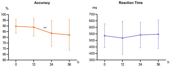 Behavioral results of accuracy and reaction time across different sleep deprivation durations (0, 12, 24, 36 h). Accuracy declined significantly between 12 and 24 h (** means p < 0.01).
