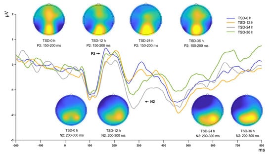 ERP waveforms and topographical maps showing the P2 (150–200 ms) and N2 (200–300 ms) components across different sleep deprivation durations (0, 12, 24, and 36 h).