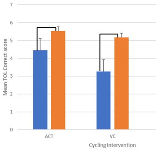 Mean correct score on the Tower of London as a function of cycling intervention (ACT, VC) and time (pre, post). Pre scores are in the first blue bar of each group and post scores are in the second orange bar of each group and the black line indicates significant differences.