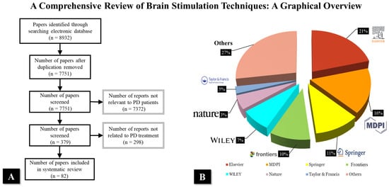 This comprehensive review was conducted to provide a broad synthesis of the current literature on brain stimulation techniques in PD. The methodology was designed to ensure a thorough exploration of the topic while maintaining flexibility to include diverse studies relevant to the therapeutic applications of brain stimulation. To gather relevant literature, a structured search was performed across several reputable databases and publisher websites, including PubMed, ScienceDirect, Springer, MDPI, Frontiers, and Wiley Online Library. The search was conducted using a combination of carefully selected keywords, such as “Parkinson’s disease”, “Non-invasive brain stimulation”, “Therapeutic potential”, “Brain stimulation techniques”, and “Parkinson’s treatment”. The search was restricted to peer-reviewed articles published in English, with a focus on studies published in the last ten years (i.e., between 2015 and 2024). However, particular emphasis was placed on more recent publications (2020–2024) to ensure the inclusion of the latest advancements in the field. The selection of articles was guided by specific inclusion and exclusion criteria. Reviews, meta-analyses, and original research articles published in peer-reviewed journals were prioritized. Conversely, studies not directly related to Parkinson’s disease or brain stimulation techniques, articles focusing solely on animal models without translational relevance, and non-peer-reviewed materials such as conference abstracts or editorials were excluded. The reviewed paper analyses are shown in Figure 1, which shows the publication distribution of the 82 reviewed papers, categorized by publisher and year of publication. In terms of publishers, the majority of the papers were published by Elsevier, accounting for 20.99%, followed by MDPI with 16.05%, and Springer with 11.11%. Other notable publishers include Frontiers (9.88%), Wiley (7.41%), and Nature (4.94%). A smaller portion of papers, 2.47%, were published by Taylor & Francis, while 27.16% were classified under ’Others’. Regarding the year of publication, the majority of the papers (91.36%) were published since 2020, with a total of 74 papers, while seven papers (20.99%) were published before 2020.
