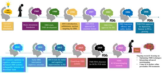 In the 11th century, Ibn Sidah, a renowned physician, proposed the use of a live electric catfish as a treatment for epilepsy []. The timeline of brain stimulation in PD (Figure 2) begins in the 18th century with Luigi Galvani’s pioneering work on the electrical stimulation of animal tissues, which laid the groundwork for the field of electrophysiology and the concept of bioelectricity []. In the 1960s, initial observations suggested that lesions in the basal ganglia could alleviate symptoms of PD, paving the way for future brain stimulation techniques []. The 1980s marked the commencement of early trials exploring the application of DBS. This decade also witnessed the development of TMS, providing a non-invasive method to stimulate the human brain and allowing researchers to study brain–behavior relationships. The 1990s saw the introduction of transcranial direct current stimulation (tDCS), offering a simple, portable, and non-invasive method to modulate cortical excitability. Significant advancements in DBS techniques were observed during this time, particularly with the targeting of the subthalamic nucleus in 1993, which demonstrated substantial improvements in the motor symptoms of patients with PD, further solidifying the role of neurostimulation in managing neurological conditions.