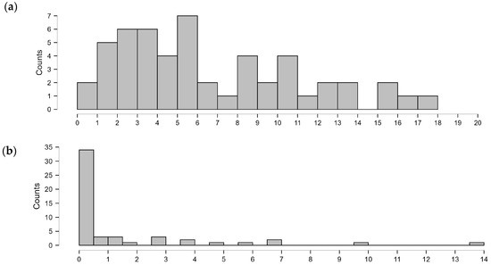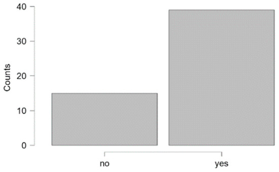 The occurrence of disfluencies in the speech of children in the study group was often indicated by respondents (30 respondents, 55.56%, Figure 7). We conducted an analysis to examine whether the age of onset of various stages of speech development, such as babbling, first words, and first sentences, had a significant relationship with the occurrence of speech disfluencies in the study group. For this purpose, we divided the subjects into a group with speech disfluencies and a group without disfluencies. Data on the subjects’ age at milestones in the groups were not normally distributed (Shapiro–Wilk test: p < 0.05). Therefore, the Mann–Whitney–Wilcoxon test was used to assess the differences. The median age of children in both groups was not significantly different, which shows that the groups were homogenous. The results (Table 6) showed no significant differences in median values between the study groups in the age of babbling onset, producing first words, and first sentences. The analysis showed that the age of reaching milestones related to the child’s speech development, such as babbling, first words, and first sentences, was not correlated with the presence of speech disfluencies.