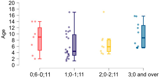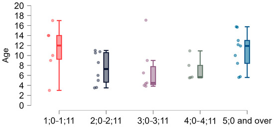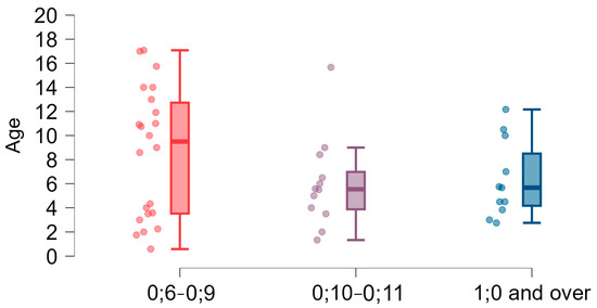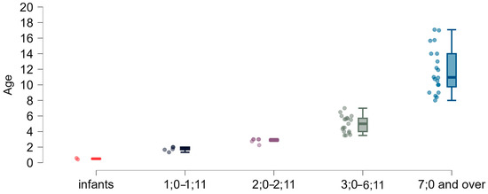 - “1;0–1;11”—children from 1 up to 2 years of age (5 participants);