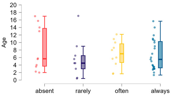 To verify whether there is a relationship between the age of the subjects and their ability to diversify communication signals, we compared the age of participants in groups with different frequencies of signal diversification ability (always/often/rarely/absent). The data describing the age of the respondents in the groups were not normally distributed (p = 0.003). Therefore, we compared the median age between groups using the Kruskal–Wallis test (p = 0.744). The results showed no statistically significant differences in the age of children with differing abilities to differentiate communication signals.