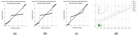 This figure is a graph explaining the simple linear uni-variable regression of the UFOV subtest by increasing age: (a) normal P–P plot of regression standardized residual with subtest 1; (b) normal P–P plot of regression standardized residual with subtest 2; (c) normal P–P plot of regression standardized residual with subtest 3; and (d) scatter plot between UFOV subtests and age.