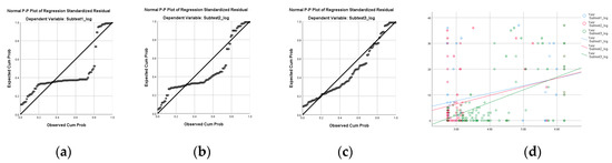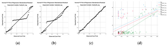 This figure is a graph explaining the simple linear uni-variable regression of the UFOV subtest by increasing age: (a) normal P–P plot of regression standardized residual with subtest 1 log data; (b) normal P–P plot of regression standardized residual with subtest 2 log data; (c) normal P–P plot of regression standardized residual with subtest 3 log data; and (d) scatter plot between UFOV subtests’ log data and age.