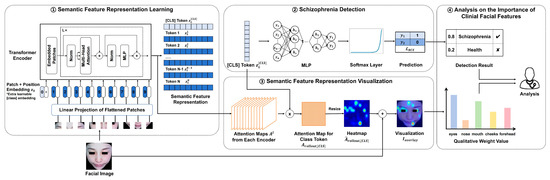 In this section, the proposed method will be introduced in detail, including how facial semantic feature representations are learned and are then applied in detection and how key semantic features of face diagnosis images are visually interpreted. After these, the importance of different facial regions in SZ detection can be quantified by calculating their weight value with a self-attention mechanism. Figure 1 presents the framework proposed.
