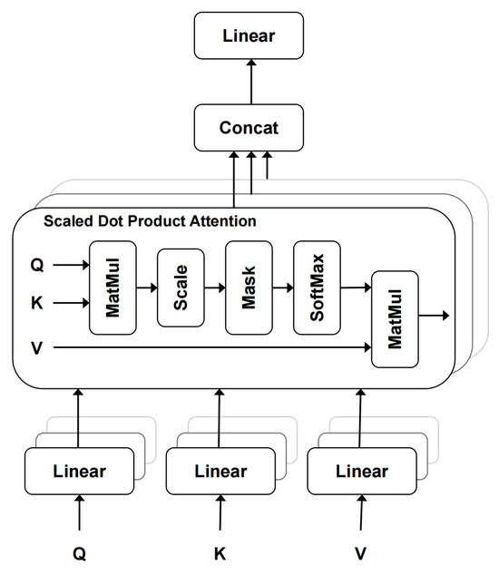 Self-attention module. k self-attention operations are run in parallel and project their concatenated outputs. The self-attention operation is based on the query vector Q, and the weight distribution is obtained by calculating the similarity between the query vector and all key vectors K, which is used to weight the associated numerical vector V.