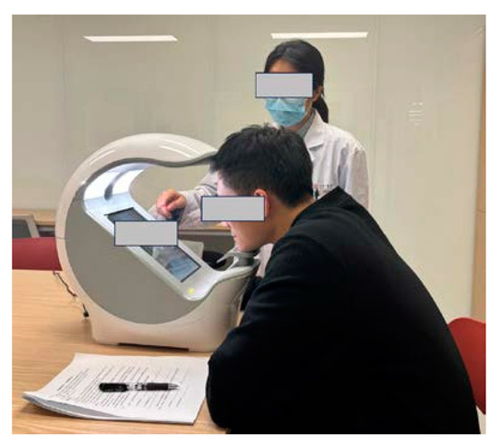 A portable intelligent TCM diagnostic device independently developed by the Shanghai University of Traditional Chinese Medicine (model: TYJK201911D-B, patent numbers: ZL201921720435.8, ZL201930553056.3) [37,38] was used as the sampling instrument. As shown in Figure 3, participants were informed of the precautions to be taken prior to image acquisition, including avoiding makeup, removing glasses, and ensuring that hair did not cover the forehead. After reading and signing a written informed consent form, they were seated in a sitting position in front of the device, placing their chin on the chin rest and their forehead gently against the upper support. During acquisition, participants were asked to remain still, face the screen, and ensure that their entire face was located within the designated frame. Frontal facial images were then captured and stored securely for further analysis. General demographic information, including sex, age, height, weight, and other relevant details, was collected for each participant. These data were recorded and saved in an Excel document for subsequent statistical analysis. To ensure data consistency, the same image acquisition procedure was followed for both the schizophrenia group and the healthy control group.