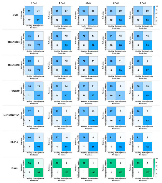 Further, the confusion matrix showed the five-fold cross-validation results of different models, as shown in Figure 4. It is demonstrated that SVM performed poorly because approximately one-third of the healthy individuals were misclassified as SZ patients. The performance of VGG19 was similar to that of SVM, and many healthy individuals were incorrectly detected as SZ patients, affecting the overall accuracy. The results of ResNet34 and ResNet50 achieved high accuracy and demonstrated good detection ability, but some healthy individuals were still misclassified as SZ patients, possibly due to the model’s insufficient precision in identifying facial feature representation in healthy individuals. The confusion matrix of BLIP-2 showed a significant reduction in the number of misclassifications, indicating greater reliability in identifying healthy individuals and SZ patients. Our proposed model achieved the best performance in all tests. In the five-fold cross-validation, particularly in folds 2 to 4, only two face diagnosis images were misclassified. This demonstrates the exceptional capability of our model in distinguishing between healthy individuals and SZ patients.