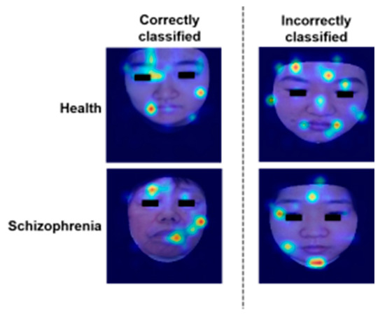 Figure 6 further illustrates examples of both correctly and incorrectly classified cases for healthy participants and SZ patients. In correctly classified cases, the model demonstrates a consistent focus on the eye and mouth regions, aligning with known clinical features indicative of SZ. For instance, a correctly classified SZ patient (bottom left image) shows heightened attention around the eyes and mouth, which are critical regions for diagnosing mental conditions.