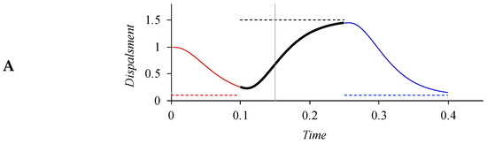Sequential and blended target approximation processes generated with the qTA model [102]. The units of both axes are arbitrary. In (A), the three target approximation movements are strictly sequential, and the vertical line is the boundary between the first two movements. In (B), the vertical reference remains at time 0.15, but the first movement is shortened by 0.05 units. All the movements remain sequential (which means that the “tail” of the first movement—the dotted continuation—is truncated). In (C), the first and second movements overlap with each other by 0.05 units. The overlap is implemented by inserting a blended target (dotted green horizontal line), which is the average of the first two targets.