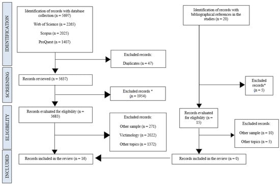 Figure 1 displays a flowchart of the selection procedure. A total of 5697 potential articles were identified through electronic research and reviewed based on their titles and abstracts for eligibility. After 1954 references were removed because their abstracts did not match the inclusion criteria, 3683 full texts were examined. Of them, 3667 studies were excluded because they did not meet the inclusion criteria: 271 studies did not have a control sample, 2022 based their findings around victimology and 1372 studies only took some neurobiological and/or neurocognitive factors in executive functions but not as the main topic. Therefore, the search identified 16 published articles to be included for review, all written in English and published in peer-reviewed journals between 2009 and 2024.
