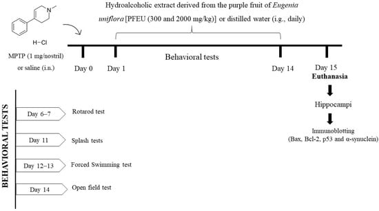 One day after MPTP administration, PFEU treatment began and persisted for 14 days through intragastric gavage (ig). Animals received PFEU at doses of 300 and 2000 mg CAE/kg/day or vehicle (distilled water, 3 mL/kg/day) []. The administration of PFEU occurred either after the completion of the behavioral tasks or at the end of the day. Behavioral tests began six days after MPTP administration, and the hippocampi were dissected as whole structures on day 15, as shown in Figure 1.