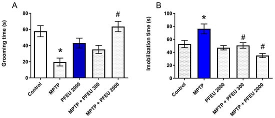 Effects of PFEU on depressive-like behaviors in female rats treated with intranasal MPTP. Behavioral outcomes in (A) the Splash test and (B) the Swimming test were assessed following treatment with PFEU at doses of 300 and 2000 mg/kg/day in the context of MPTP administration. Results are expressed as the mean ± SEM (n = 8–11 per group). * Indicates p < 0.05 versus the control group, and # indicates p < 0.05 versus the MPTP group (one-way ANOVA with Tukey’s post-hoc test).