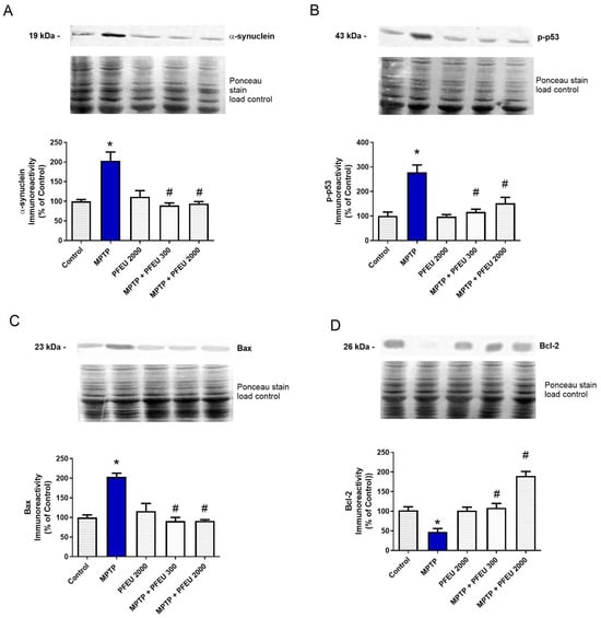 Effects of PFEU on hippocampal apoptotic markers and α-synuclein levels in female rats treated with intranasal MPTP. Hippocampal protein levels of (A) α-synuclein, (B) p-p53, (C) Bax, and (D) Bcl-2 were analyzed following treatment with PFEU at doses of 300 and 2000 mg/kg/day in the context of MPTP administration. Results are expressed as the mean ± SEM (n = 5/group). * Indicates p < 0.05 versus the control group, and # indicates p < 0.05 versus the MPTP group (one-way ANOVA with Tukey’s post-hoc test).