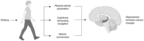 The contribution of this systematic review can also provide an additional lens of insights for recent reviews on sedentary behaviors and brain health [32] and on sedentary behaviors and BDNF [33]. Walking is suggested to be a promising free-living physical activity, where free-living physical activities can similarly be quantified as MET minutes per week [34], which aligns with the recent novel framework of environmental affordance for physical activity [35]. Last but not least, this systematic review aims to explore how walking can increase the hippocampal volume, if possible, since the latter is inversely associated with the rate of depression [36,37,38], and how it can improve cognition and mental health by spending time outside the house [39,40]. This systematic review also contributes towards enriching the novel theory of environmental affordance for physical activity [35], which considers walking as one of the ways through which the environment can promote physical activity.