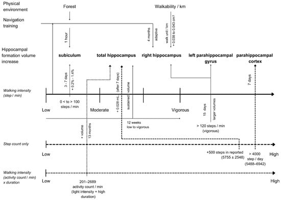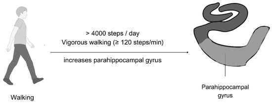 Two studies in this systematic review showed that a higher step count (>4000 steps/day) was associated with an increase in the parahippocampal cortex [52] and that vigorous walking (≥120 steps/min) was associated with a larger left-parahippocampal gyrus [48]. Both studies suggest that higher-level physical activity is better for the parahippocampal gyrus, unlike earlier studies showing that lower-level physical activity is better for the subiculum. Figure 8 illustrates the effective walking parameters needed to increase the parahippocampal gyrus volume, which can be facilitated using treadmills or through the environment [35].