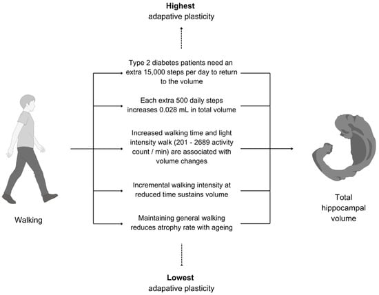 Despite the scarcity of studies, the common focus on total hippocampal volume allowed for more insights into what walking factors, specifically those related to physical activity, affect the total hippocampal volume. As shown in Figure 4, walking was found to be effective for maintaining, increasing, and even reversing the hippocampal atrophy associated with certain health conditions (e.g., type 2 diabetes).