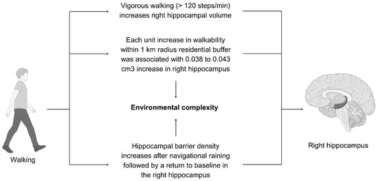 While in the previous section we encouraged designing environments to increase walking for a potential increase in total hippocampal volume, we also emphasized that specific built environment parameters can specifically increase the right hippocampus, as evidenced by Cerin et al. [54] and Lövdén et al. [57] in this systematic review, as shown in Figure 5, while vigorous walking was specifically also reported to be positively associated with the right hippocampus volume [48].
