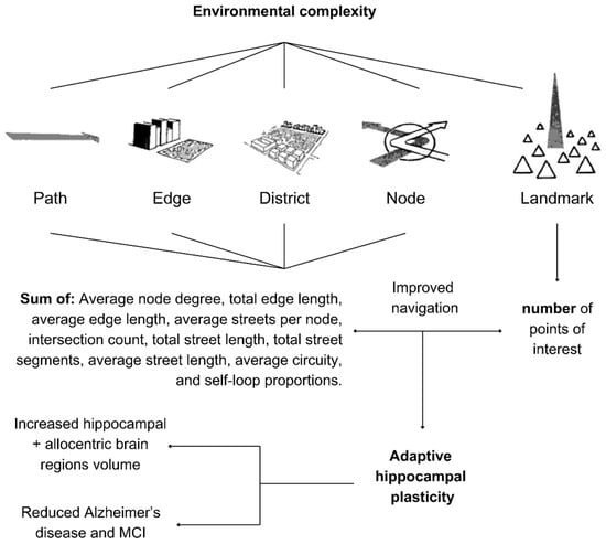 Environmental complexity was quantified in a few studies. Yuan and Kennedy [71] developed their construct of environmental complexity after Kevin Lynch’s five elements in his The Image of the City book: paths, edges, districts, nodes, and landmarks, emphasizing that there is a necessity to step beyond relying on single elements and emphasizing that their patterning create the needed complexity [76,77]. They obtained data for paths, edges, and nodes from measures of street networks, while points of interest (POIs) captured landmarks with diverse geographic characteristics, physical structures, buildings, shops, malls, educational institutions and schools, industrial buildings, government facilities, and others. The quantification of networks was developed after Boeing’s network measures were implemented to quantify the geometric, topologic, and positional characteristics of road networks [78]. Yuan and Kennedy [71] calculated thirteen network measures related to the city and selected the four least-correlated network measures (which we see as in line with the concept of synchronization of increasing quantity with diversity for spatial complexity), resulting in focusing on intersection count, average streets per node, average street length, and average circuitry. This approach was argued to be well reflective of Lynch’s image of the city theory. Shin et al. [70] employed ten street-network metrics and POIs, totaling 20 measures to assess environmental complexity. Each zip-code zone was scored from 0 to 20 based on these metrics. Thus, the right hippocampus is adaptive to vigorous-intensity walking, increased walkability, and navigational complexity in the urban environment. If the design of urban environments can achieve these three parameters, then it could be ideal for the right hippocampus rather than relying on a long route compared to more complex navigation.