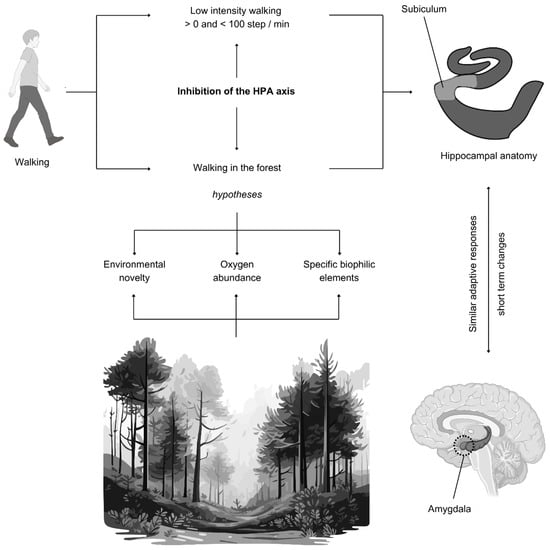 Figure 7 maps out the complex walking–environment–subiculum dynamics to guide future research. We urge future research to experiment on subjects proven to benefit from HPA axis stress responses at this preliminary stage of exploring the elements in nature or novelty responsible for subiculum plasticity.