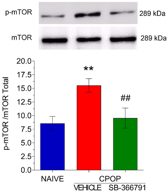 As shown in the previous experiment, after CPOP, an increase in the spinal mTOR protein levels was found. Then, an experiment was conducted to evaluate whether this activation influences mTOR expression. Interestingly, pretreatment with the TRPV1 antagonist SB-366791 at a dose of 28.7 µg/5 µL prevented the increase in mTOR expression, suggesting that TRPV1 may influence the activation of this protein (Figure 5).