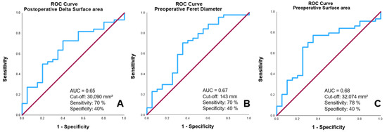 Figure 3. ROC Curves for predicting 30-day outcomes based on postoperative changes in postoperative Δ surface area (A), preoperative Feret diameter (B), and preoperative surface area (C).