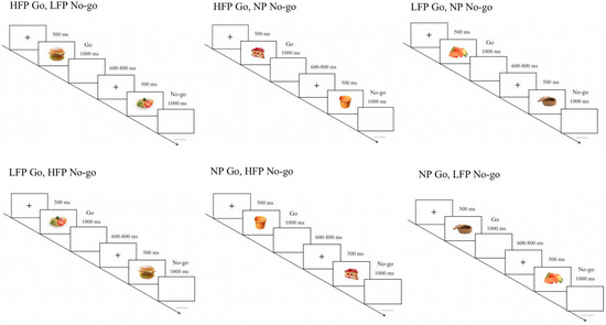 Food-related Go/No–go task paradigm (six blocks presented in a randomized order). HFP = high-calorie food picture; LFP = low-calorie food picture; NP = neutral picture.