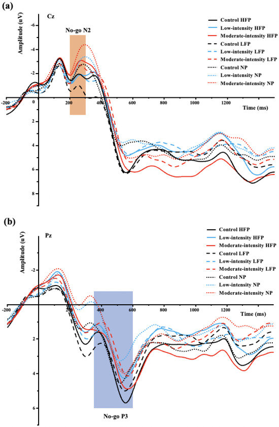 (a) No−go N2 average amplitudes at Cz site and (b) No−go P3 average amplitudes at Pz site across task conditions and picture types for the food−related Go/No−go task following moderate−intensity, low−intensity exercise, and control session. HFP = high−calorie food picture; LFP = low−calorie food picture; NP = neutral picture.