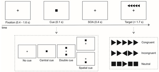 Participants sat in a quiet room in front of a laptop computer. The laptop display was placed approximately 50 cm from the viewer (display size = 29° × 22° of visual angle). Participants were administered with the Attention Network Test (ANT; [5]), running on PsychoPy 2022.2.5 (https://www.psychopy.org (accessed on 3 April 2023)).