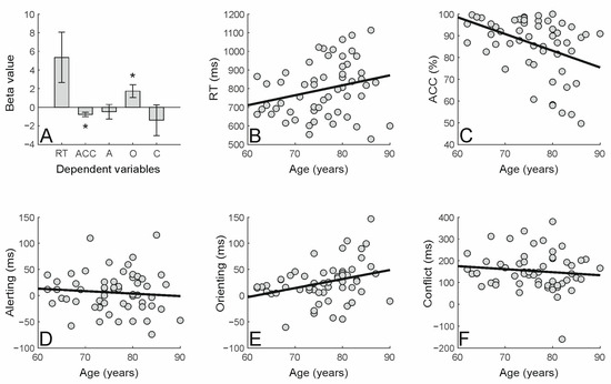 (A) Standardized regression coefficients (beta values) derived from the multivariate regression model (MRM) used to assess the predictivity of age on the measured variables: Reaction times (RT), percentage of accuracy (ACC), alerting (A), orienting (O), and conflict (C; see also Table 2; the error bars represent the standard error of the mean). The asterisks indicate significant effects (p < 0.05) (B–F) Scatter plots illustrating the relationship between the measured variables and the participants’ age.