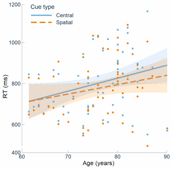 Scatter plot illustrating the relationship between the reaction times (RT) to central and spatial cues and the participants’ age. The bands around the regression lines represent the 95% confidence interval.