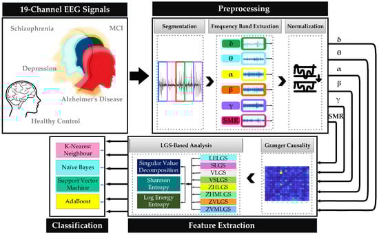 The proposed framework initiates with the segmentation of signals and the extraction of EEG frequency bands. Following the normalization of the data, Granger causality is computed between each EEG electrode to construct the Granger matrix. Subsequently, eight LGS features are extracted from each Granger matrix, and the LGS attributes are quantified utilizing Singular Value Decomposition (SVD), log energy entropy, and Shannon entropy. Ultimately, four machine learning algorithms are evaluated for the classification of five states: healthy normal, schizophrenia, MCI, Alzheimer’s disease, and depression. Figure 1 presents a block diagram of the proposed scheme, with each stage of the process elaborated upon in the subsequent sections.